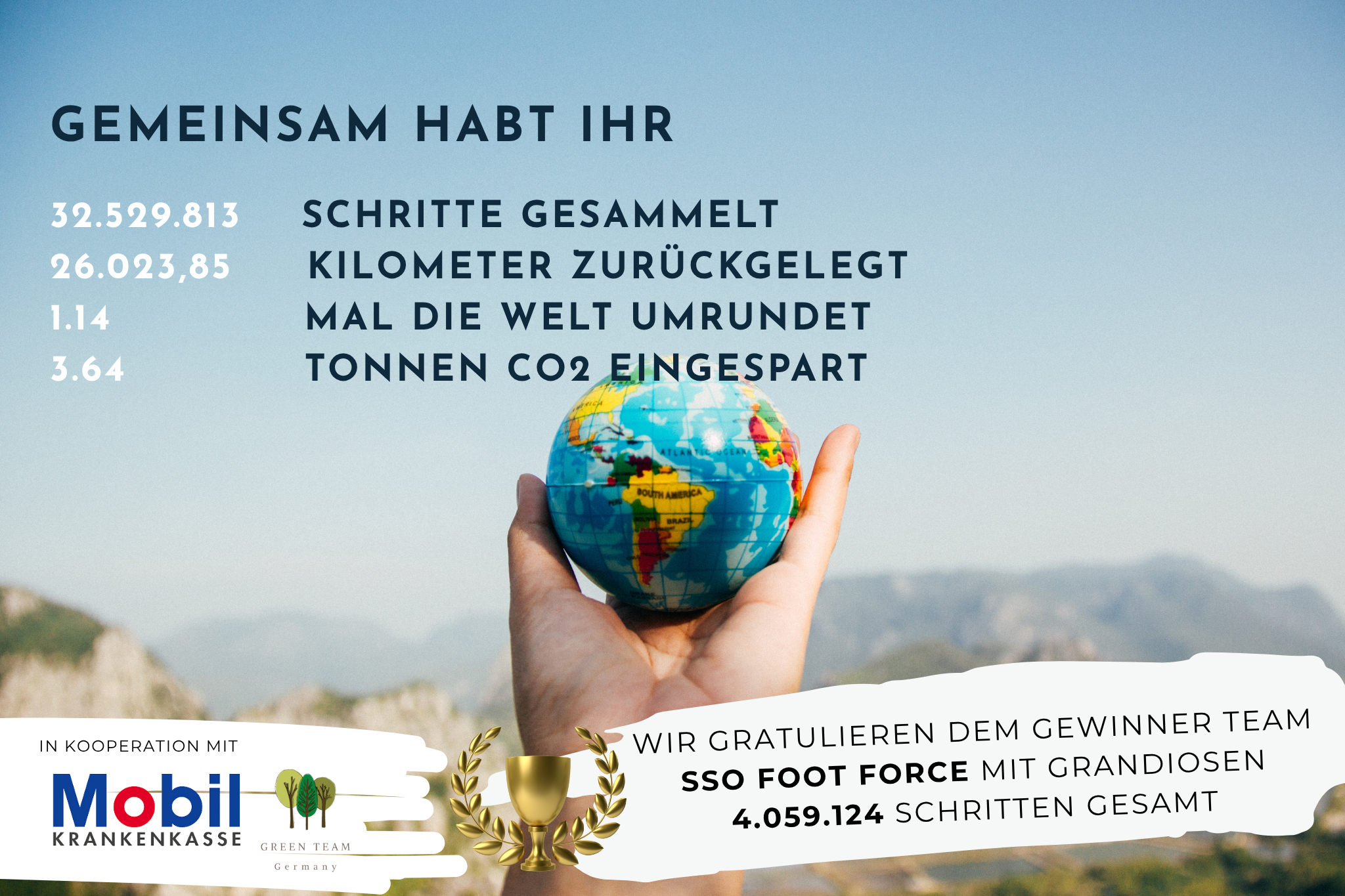 - Gemeinsam habt ihr insgesamt 32.529.813 Schritte zurückgelegt – das entspricht etwa 1,14 Erdumrundungen!