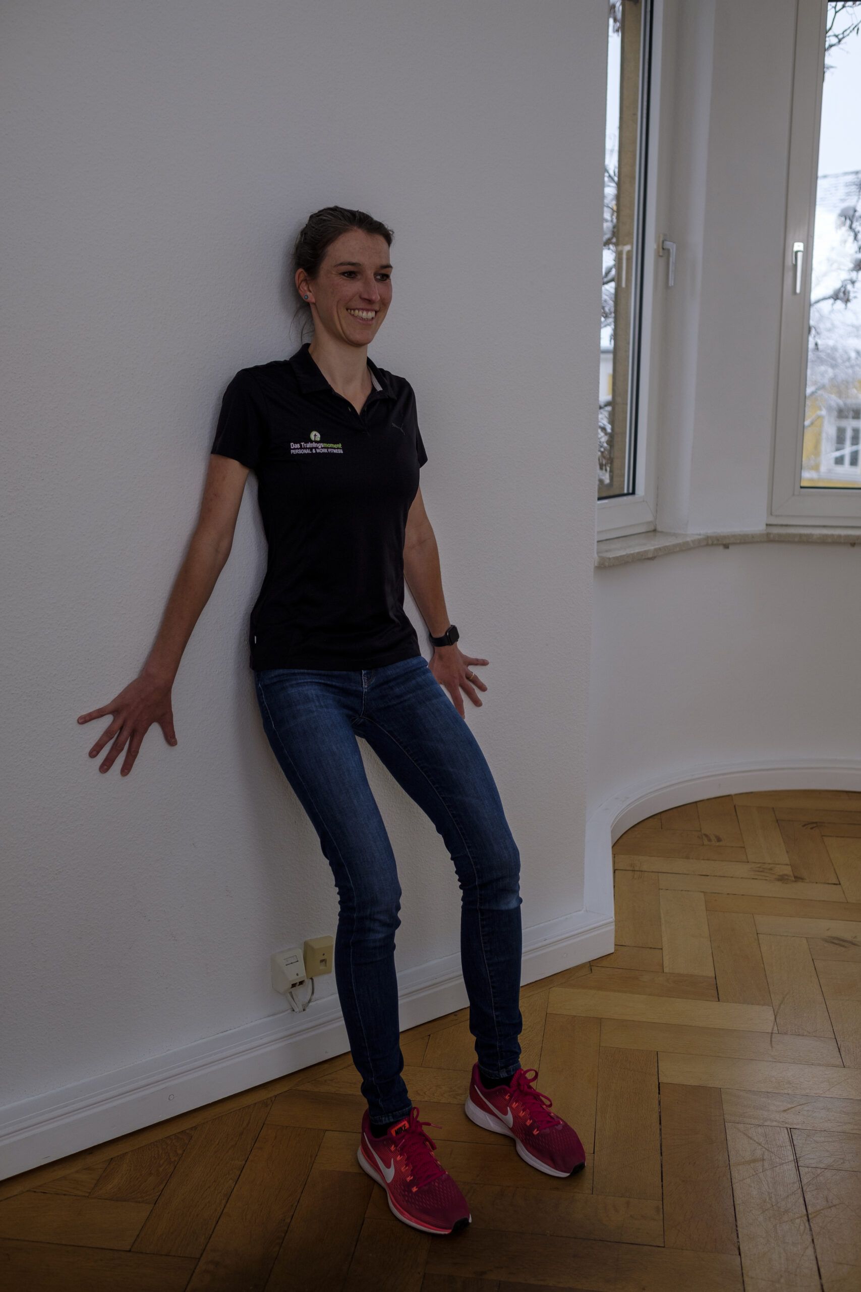 Achte darauf, dass du mit deinem gesamten Rücken, Schultern, Arme und Kopf an der Wand bist.