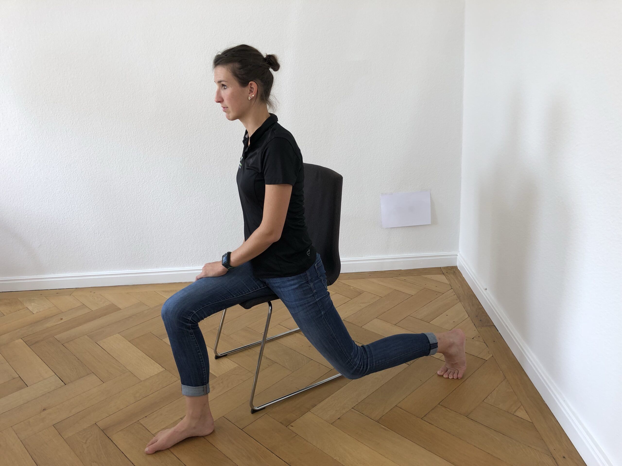 Durchführung: Setze dich an die linke Sitzkante. Führe das linke Bein nach hinten und stelle das rechte Bein nach vorn auf. Richte deinen Oberkörper auf. Führe das Brustbein Richtung Decke. Spürst du bereits eine Dehnung in der linken Leiste, dann bleibe so. Oder intensiviere die Dehnung, indem du dein Becken nach vorn aufrichtest.