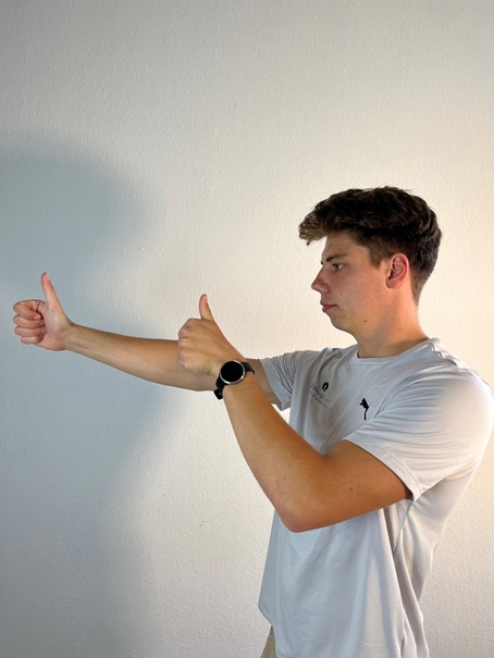 Stelle dich Aufrecht hin. Strecke einen Arm auf Augenhöhe vor dir aus und spreize den Daumen nach oben ab. Den Daumen des zweiten Arms hältst du genauso auf Augenhöhe, nur deutlich näher (ca. 10 cm) vor deinem Gesicht. Nun fixierst du mit beiden Augen den vorderen Daumen und springst dann mit deinem fixierten Blick zum hinteren Daumen, dann wieder zurück zum Vorderen und wieder zum Hinteren und so weiter. Fixieren bedeutet in diesem Zusammenhang, dass du den jeweiligen Daumen scharf und alles um ihn herum verschwommen siehst. Um die Übung zu steigern kannst du an Stelle des entfernten Daumens auch einen Gegenstand, der weiter in der Ferne liegt, fixieren. Das kann beispielsweise ein Baum sein. Du kannst die Übung auch mit einer Kräftigungsübung wie zum Beispiel dem Ausfallschritt kombinieren. Die Übung „Blicksprünge“ dient einerseits als Aktivierung müder Augen und andererseits hilft die bessere Fokussierungsfähigkeit deiner Augen langfristig deinen Körper