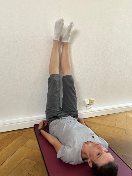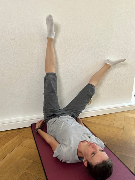 Lege dich auf deinen Rücken, positioniere dein Gesäß an der Wand und strecke deine Beine an der Wand nach oben. Sollte eine Streckung der Knie nicht möglich sein, rutsche mit deinem Gesäß ein bisschen von der Wand weg.